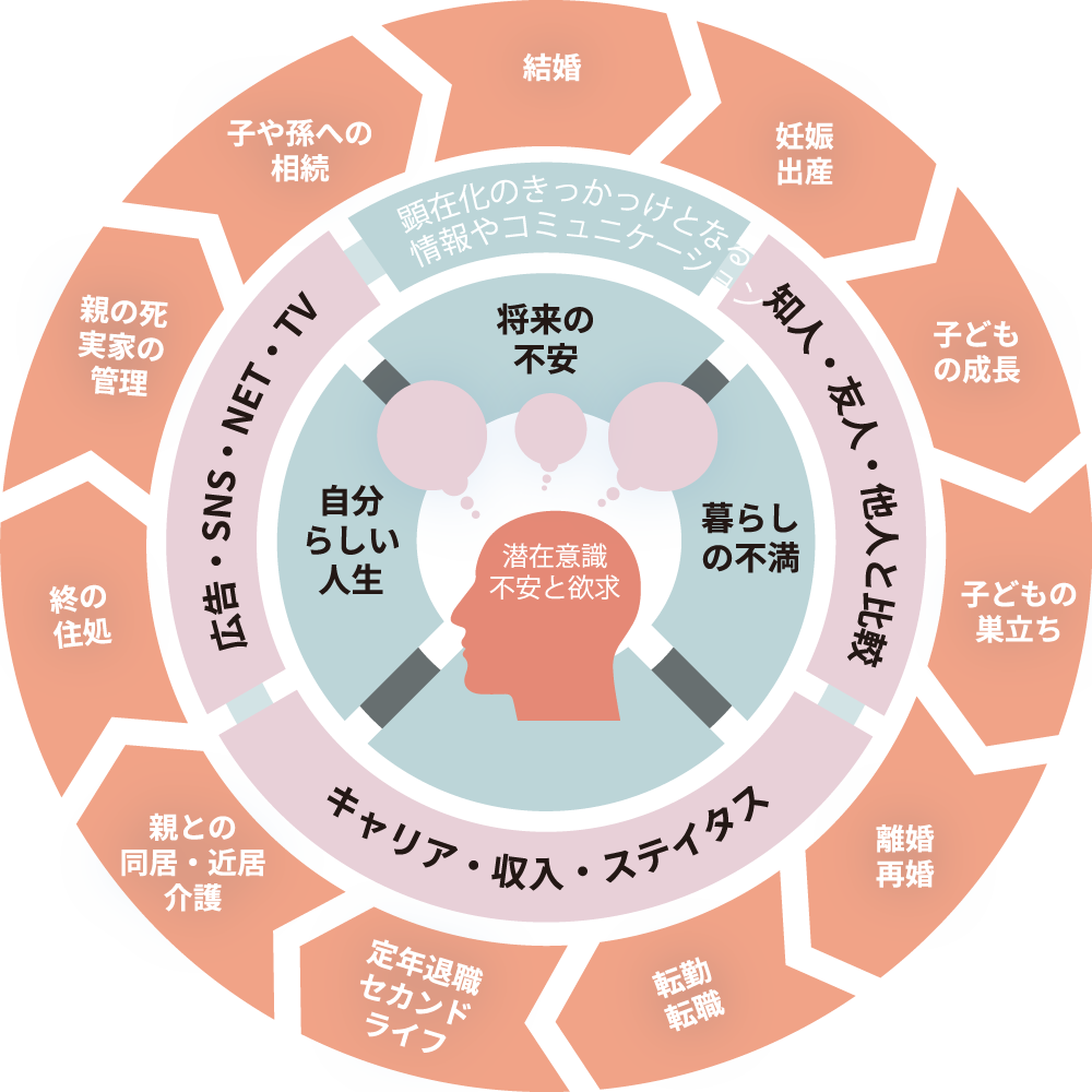 顕在化するきっかけは「他者との比較」や「広告などの情報」です。結婚した、子どもが巣立った、退職した、親の介護が始まったなどの「ライフステージの変化」のタイミングで接触する広告やSNSの情報、そして他社との比較により、住まいに対する悩みや要求、お金の不安などが顕在化するわけです。