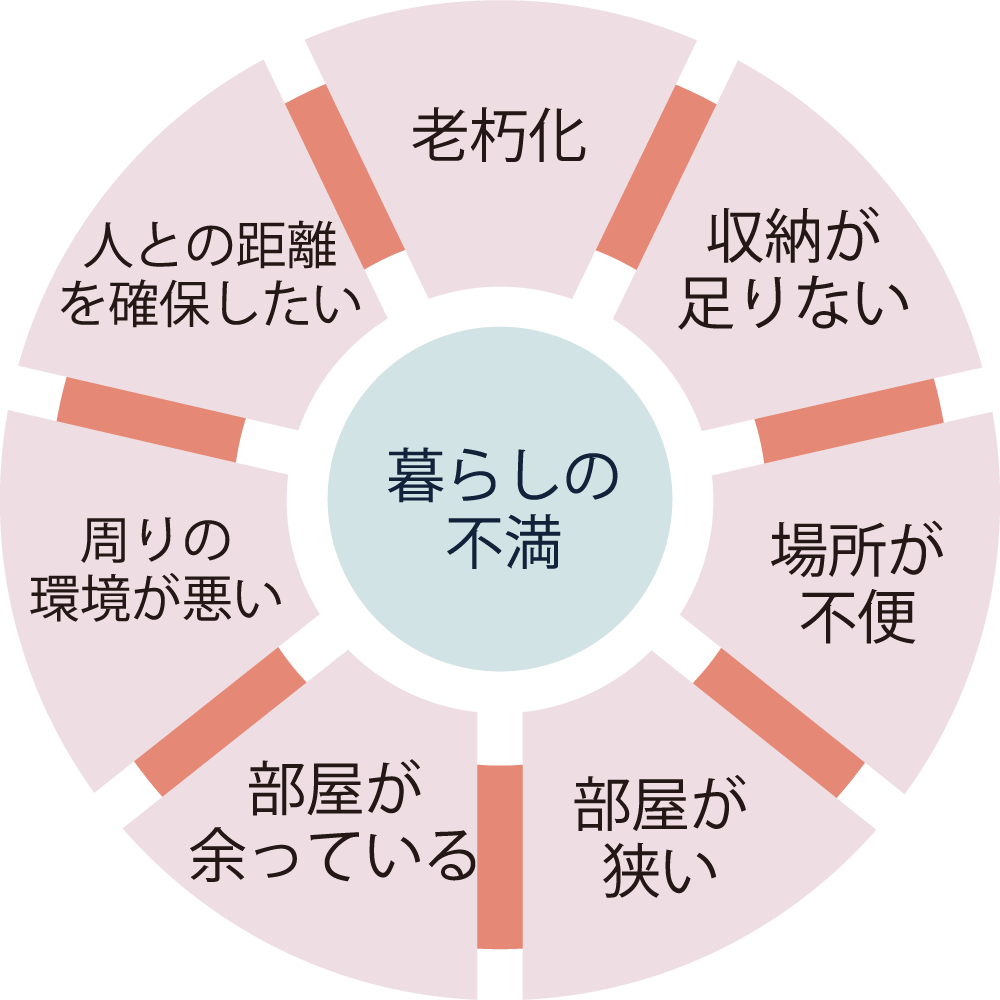 日々の暮らしの不満は堆積していきます。部屋が狭い場合は無駄なスペースを省き、部屋が余っている場合は有効活用できるように工夫する。周りの環境や人との距離にも配慮し、安心できる居場所=住まいの要素を整理してみてください。